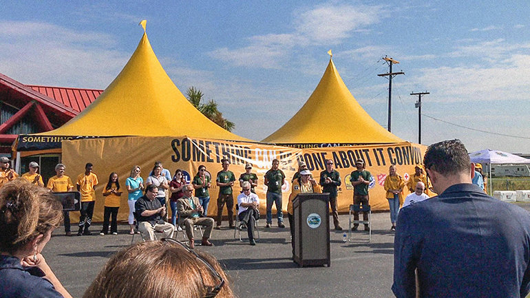 Poco después, un convoy de “Se PUEDE Hacer Algo al Respecto”, compuesto de ocho camiones grandes y una escolta de un auto policía y un camión de bomberos, viajaron tres días y noches desde Utah al aeropuerto del condado de Aransas. Aquí, los Ministros Voluntarios entregaron más de 200 toneladas de materiales de construcción a la ciudad de Rockport, todavía necesitando de suministros para reconstruir la infraestructura de la Ciudad.